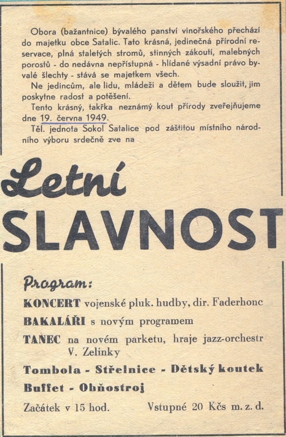 Satalický háj-obora o rozloze 16 ha byla založena kolem roku 1780 Černínem, majitelem Vinořského zámku v barokní krajinné kompozici, jejíž základy jsou patrné dodnes. Zalesněna je převážně listnatými stromy. Zalesňování se po celou tu dobu dělo přirozeným náletem, takže zde vzniklo prostředí pro velké množství vzácných brouků. Průseky jsou lemovány kaštanovými alejemi. Pro potřeby tehdejšího panstva byla na okraji obory zřízena bažantnice pro umělý odchov bažantů. Za Černínů zde byl i chov jelenů, daňků i srnčí. Černínové pěstovali i holuby a v místech bývalého hradiště pořádali závody ve střelbě na ně. Ve voliéře u satalské hájovny se pro tyto účely chovalo až 900 holubů. Těchto střeleckých závodů se s oblibou zúčastňoval i František Este a arcivévoda Karel, poslední císař dynastie Habsburků. Po 1.sv.válce se stal majitelem Vinořského panství, vrchní ředitel Živnobanky – Bělohříbek. V roce 1949 byl háj převeden na obec a 19.června téhož roku byl slavnostně otevřen pro veřejnost a r. 1951 zde byla vyhlášena přírodní rezervace vzhledem k výskytu chráněných brouků. V témže roce byla ustanovena i myslivecká společnost v obci. Na velkém palouku v oboře byl vybudován hudební pavilon, taneční parket, dětský koutek, elektrické osvětlení a konstrukce stánků, takže se zde mohli konat různé slavnosti ve velkém měřítku. Od poloviny 60.let veškeré zařízení bohužel chátralo a dnes jen nepatrné zbytky připomínají tato zařízení.